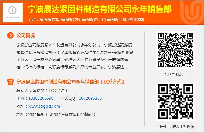 欢迎来到宁波晨达紧固件制造有限公司网站, 具体地址是河北省邯郸永年县河北省永年县河北铺新商城1区4栋9号,联系人是董晓丽。 主要经营高强度螺母,高强度螺栓,高强度内六角,高强度平垫,杭州弹垫,高强度螺母 细扣螺母 35Crmo螺母 加厚螺母 薄螺母 加厚细牙螺母 化工油田专用螺母。非标螺丝主要作用和公差, 单位注册资金未知。 本公司技术力量强大,工程技术人员多名,组合螺丝的硬度标准是怎么划分的,具有多年的生产经验,工艺达到国内高水平。不锈钢双头螺栓厂家性能先进的设备和制造精湛的工艺装备,u型螺栓。确保产品质量趋于完美。