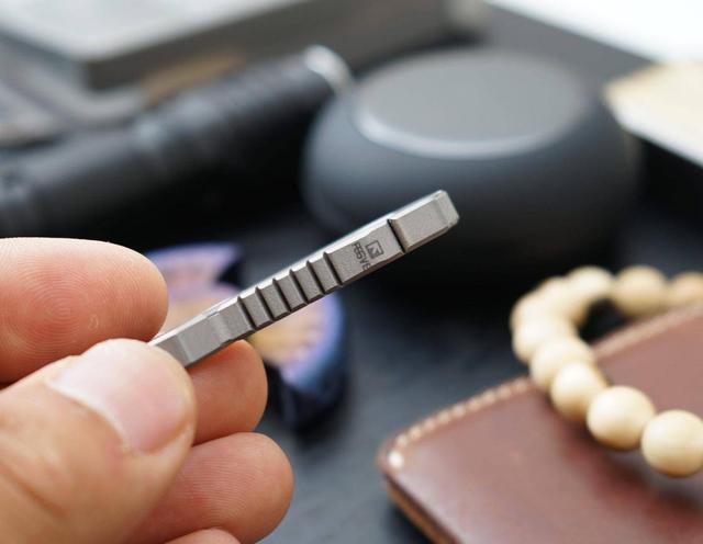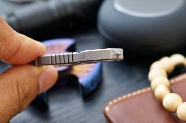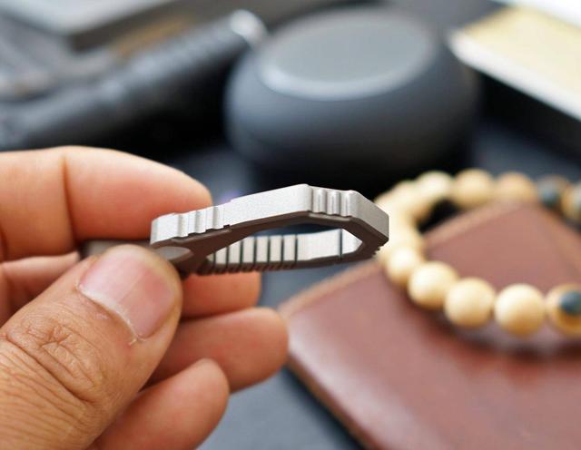 在外周为了增加美观度, FEGVE多功能钛合金一体钥匙扣还加入了类似武器装备的散热竖纹雕刻。