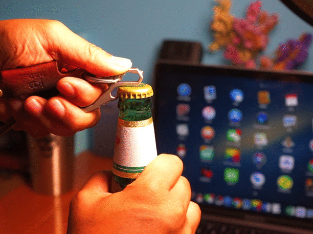 其开瓶器的不规则弧线设计,让支点更靠近瓶盖中间,而下面的卡扣又能牢牢抓住啤酒瓶盖的边角,轻松一敲即开。