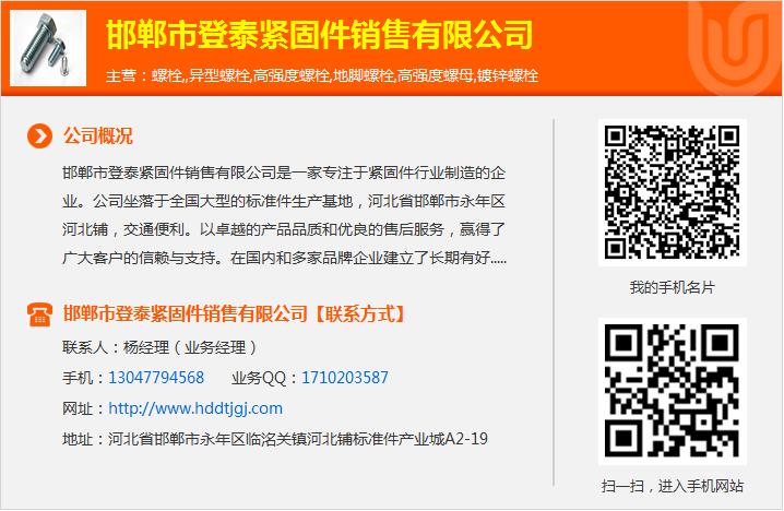欢迎来到邯郸市登泰紧固件销售有限公司网站,我公司位于地处晋冀鲁豫四省区域中心和环渤海经济区腹心,高强度螺栓的连接是什么,六角螺栓价格,国标六角螺丝孕育了新石器早期的磁山文化的邯郸市。双头螺栓规格尺寸表 具体地址是河北省邯郸市永年区临洺关镇河北铺标准件产业城A2-19,关于双头螺栓厂家,联系人是杨经理。主要经营螺栓,,异型螺栓,高强度螺栓,地脚螺栓,高强度螺母,镀锌螺栓。单位注册资金未知。