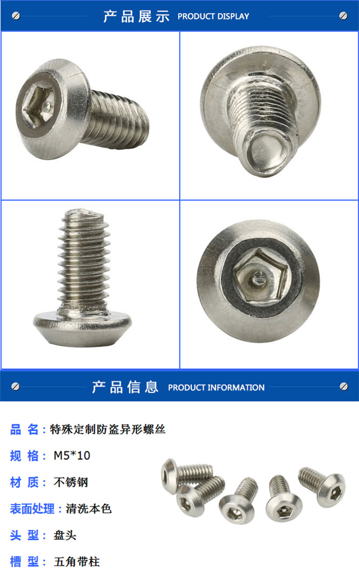 前段时间有一个客户,不锈钢u型螺丝厂家不锈钢u型丝是做某款户外交通工具的,需要一款具有防盗功能的螺丝,经过多番比较,选择定制了内五角带柱不锈钢防盗螺丝。不锈钢u型螺丝