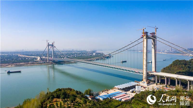 这座由湖北交投集团投资建设的长江大桥目前主体工程已经全部完工,实现全线贯通,正在进行最后的桥面施工中。