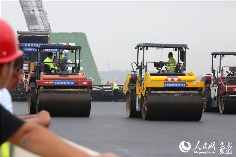 7月22日上午,连续多日阴雨后的宜都终于放晴。在长江宜昌至枝城河段的宜都长江大桥工地上,湖北交投宜昌高速公路建设管理有限公司质量管理部部长黄健正在监督工人进行主桥沥青试验段的铺设工作。“等了近五十天,才等到这个晴天。要抓紧时间争分夺秒进行沥青铺装。”黄健一边紧盯工地,一边对记者说。
