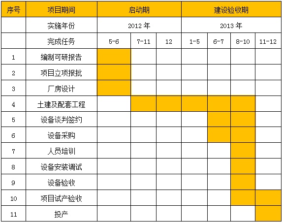 项目总投资主要来自项目发起公司自筹资金,地脚螺栓弯钩按照计划在2012年3月份前完成项目申报审批工作。预计项目总投资资金到位时间在2011年4月底。整个项目建设期内,主要完成项目可研报告编制、项目备案、土建及配套工程、人员招聘及培训、设备签约、设备生产、设备运行及验收等工作。地脚螺栓验收标准